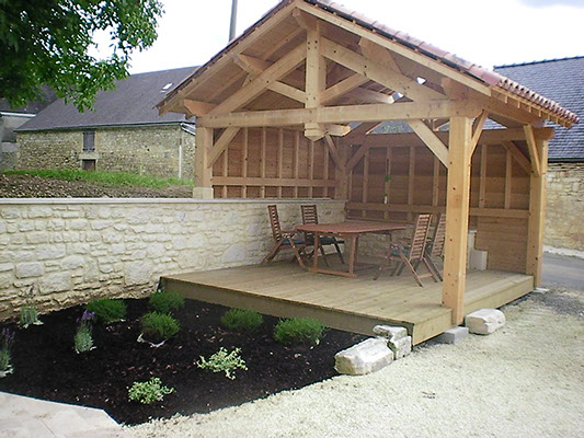 Pour découvrir l'aménagement extérieur de la maison, cliquez sur une de ces images. La maison a été entièrement rejointoyée à l'ancienne, à la chaux. Vous pourrez disposez d'un superbe abri de 20 m² , détaché de la maison, pour partager divers moments conviviaux entre amis, ou en famille. La cour peut contenir jusqu'à 4 véhicules.